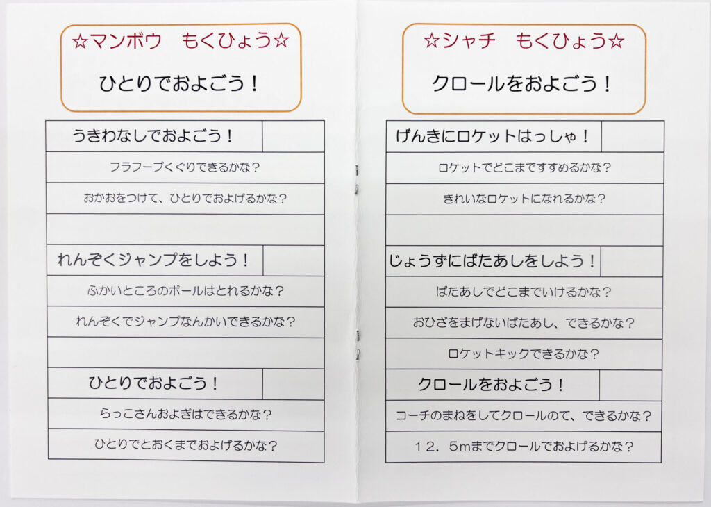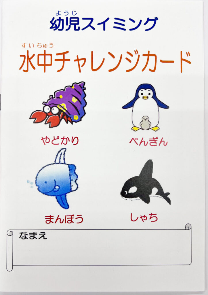 この頃から 『チャレンジカード』 が登場します。カードを使いながら、「できた!」を積み重ね、愉しく自然に泳ぎを身につけていけるようサポートします。
